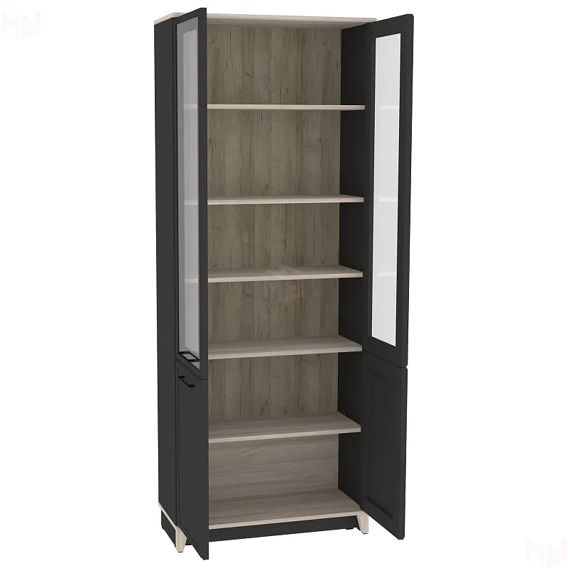 Неглубокий (355 мм) двухстворчатый шкаф для книг позволяет разместить любимые книги за прозрачным стеклом, а архив за глухим фасадом. Изысканность стиля подчеркивает тонкий фигурный профиль на фасадах, верх и низ модулей выполнены в древесном декоре. Скошенные опоры из МДФ добавляют мебели в стиле неоклассика из коллекции AURELIO нотку современной эстетики.