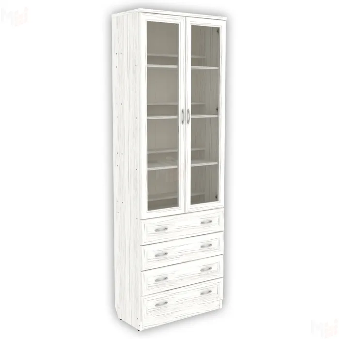 Шкаф для книг с ящиками 204, Верхняя часть оборудована четырьмя большими книжными полками. Полки одинаковы по площади и равноудаленные одна от другой. Нижняя часть шкафа оснащена четырьмя выдвижными ящичками.