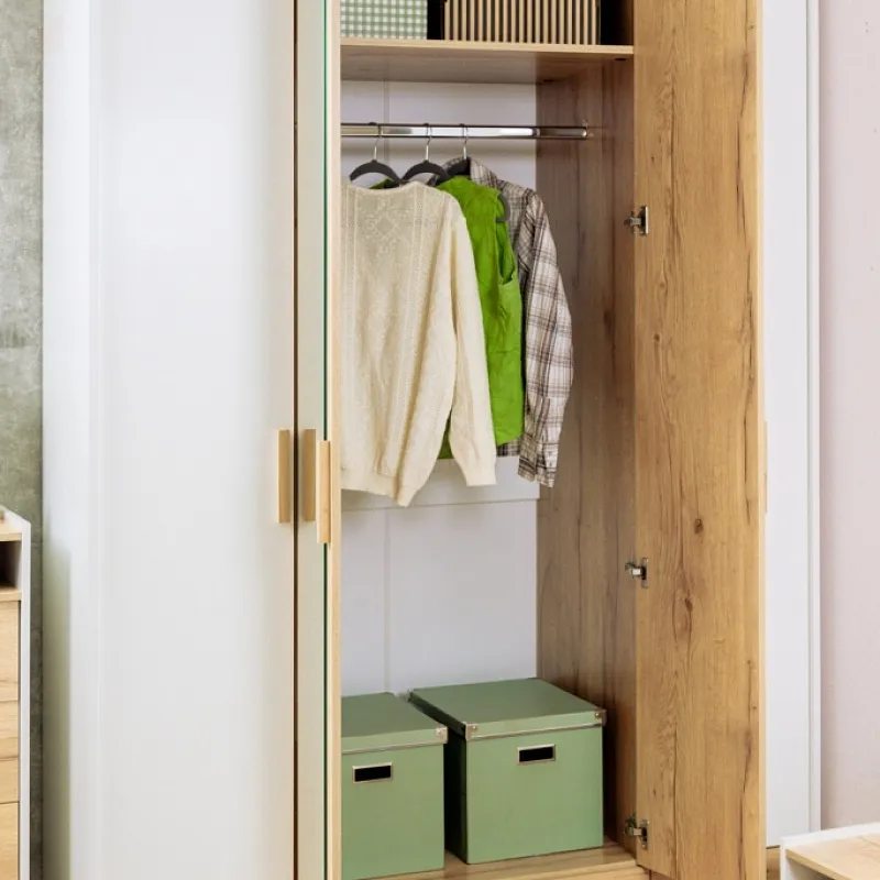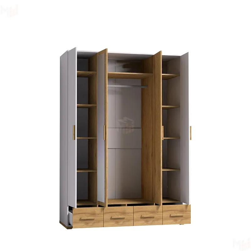Штанга выдерживает нагрузку до 40 кг. 4 выдвижных ящика комплектуются шариковыми направляющими. Такой шкаф с ящиками сможет заменить полноценный комод в маленькой спальне. Петли с доводчиками для бесшумного закрывания дверок шкафа. -