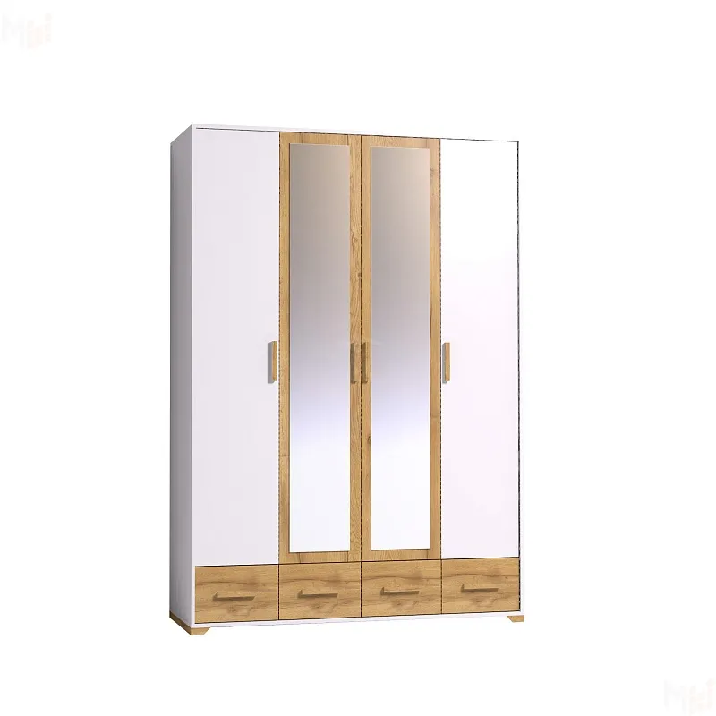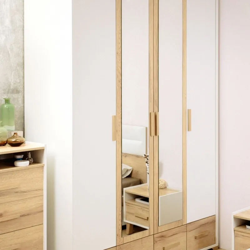 Четырехдверный шкаф для одежды и белья Айрис 555 с зеркалами и выдвижными ящиками - настоящая находка для большой и маленькой квартиры. Шкаф оснащен отделениями для хранения белья с полками на скрытых полкодержателях и отделением для одежды со стационарной штангой длиной 749 мм.