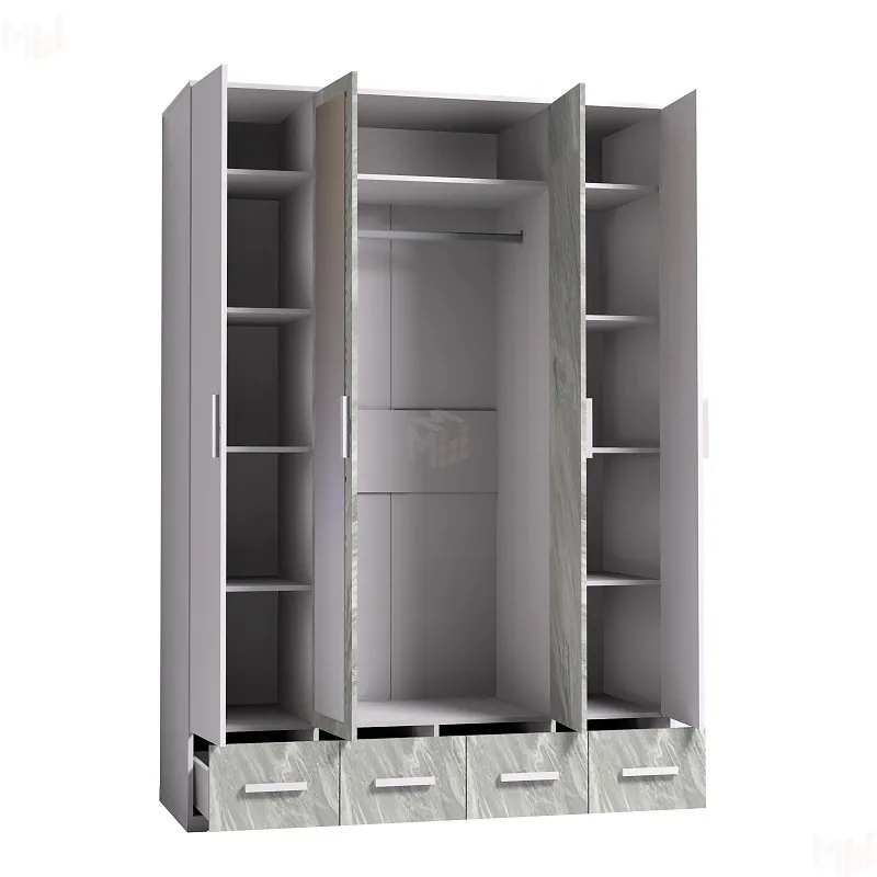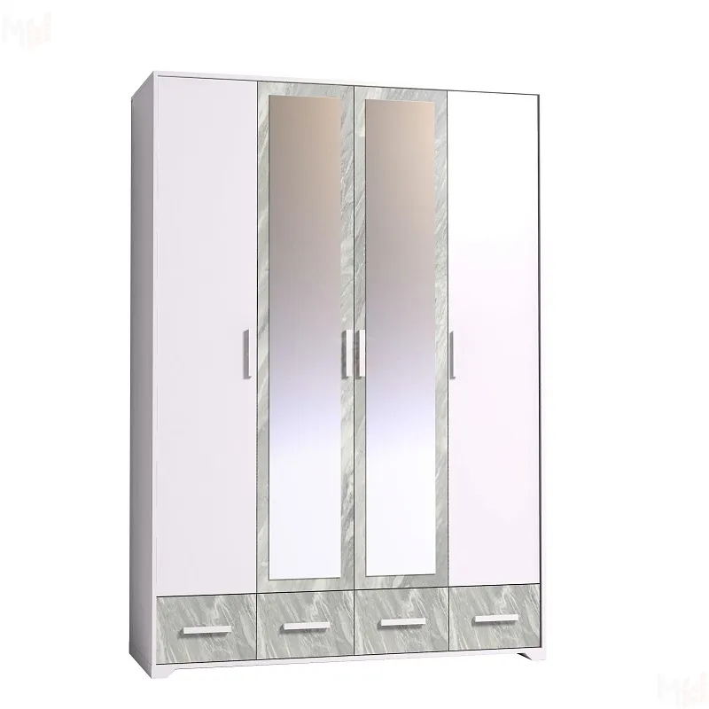 Четырехдверный шкаф для одежды и белья Айрис 555 с зеркалами и выдвижными ящиками - настоящая находка для большой и маленькой квартиры. Шкаф оснащен отделениями для хранения белья с полками на скрытых полкодержателях и отделением для одежды со стационарной штангой длиной 749 мм.