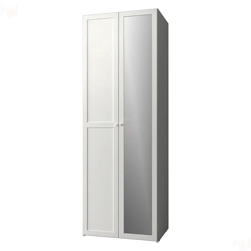 Распашной шкаф для одежды разделяется на отдельно продающиеся элементы: корпус и фасады - Зеркало и Стандарт. В этом варианте корпус совмещается с одним фасадом Зеркало и одним фасадом Стандарт. Зеркальная дверь, обрамленная профилем МДФ, в полный рост наполнит ощущением света и простора даже маленькую по габаритам спальню. Фасад Стандарт декорирован импостом по центру. Металлические ручки на позволят открывать дверь с зеркалом, не прикасаясь к зеркальному полотну, а, значит, его не придется часто протирать. Внутреннее наполнение - стационарная штанга и две полки