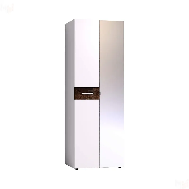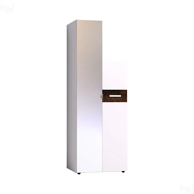 Глухой белый фасад модуля декорирован контрастной вставкой из ЛДСП и светлой ручкой из массива. Зеркальный фасад с металлической ручкой-скобой. Внутреннее наполнение модуля - стационарная штанга длиной 757 мм и две полки. -