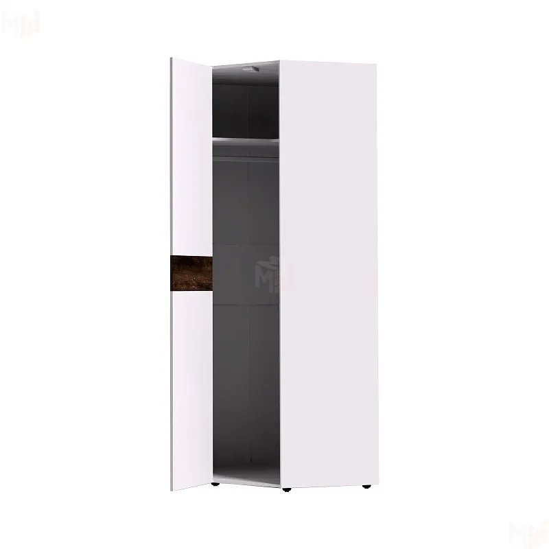 Норвуд 156 Шкаф угловой оснащен стационарной штангой, полочками для белья и беспроводным светодиодным светильником, который включается при открывании двери. Это особенно удобно, если нужно найти в шкафу вещи, не потревожив близких. Легкая установка на магнитное крепление - не требует сверления, прокладывания провода, подключения к сети.