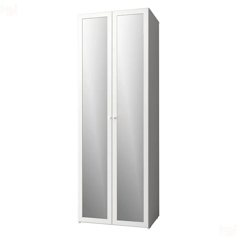 Распашной шкаф для одежды разделяется на отдельно продающиеся элементы: корпус и фасады - Зеркало и Стандарт. В этом варианте корпус совмещается с двумя фасадами Зеркало. Зеркальная дверь, обрамленная профилем МДФ, в полный рост наполнит ощущением света и простора даже маленькую по габаритам спальню.