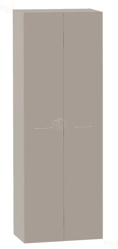 Шкаф двухдверный выполнен из ЛДСП цвета Капучино и имеет 2 вместительных полки в верхней части шкафа, 4 полки в правой части, и штангу для одежды на плечиках - в левой. Ручки в форме скобы выполнены из белого матового металла. Все петли - плавного закрывания. -
