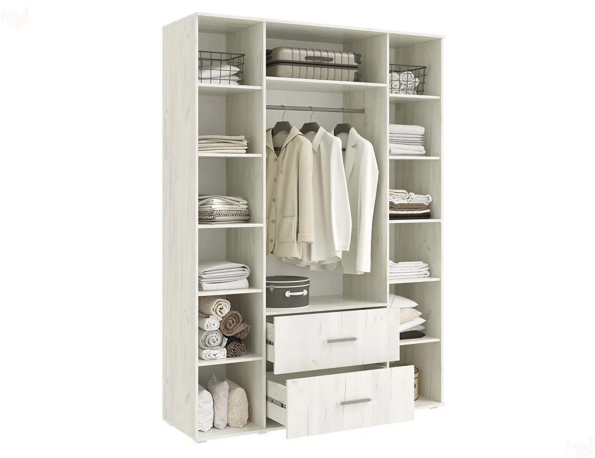 В боковых секциях разместились отделения с полками, в центральной части за распашными дверками штанга для одежды.