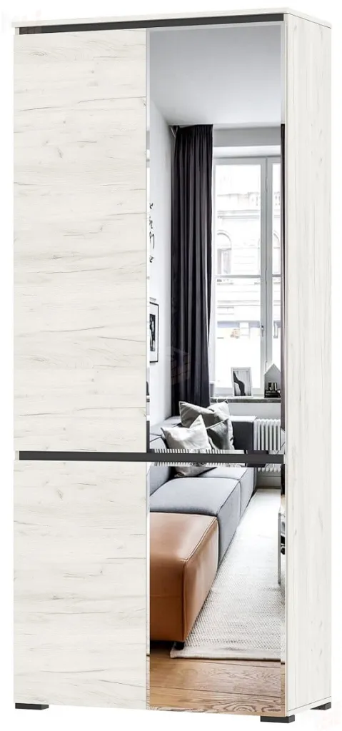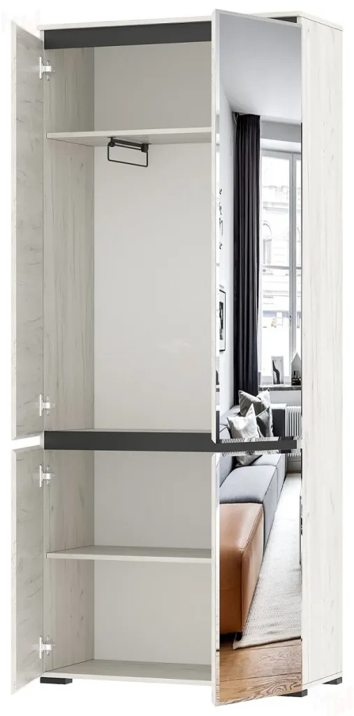 Шкаф 2С2ЗР "ГРЕТТА" 4-створчатый, с поперечной металлической штангой для верхней одежды, с полками. Применение интегрированной ручки на фасадах делает модель стильной и безопасной – дверцы открываются за профилированные выступы. Фасады обработаны кромкой 1 мм. Чёрная регулируемая ножка-опора.