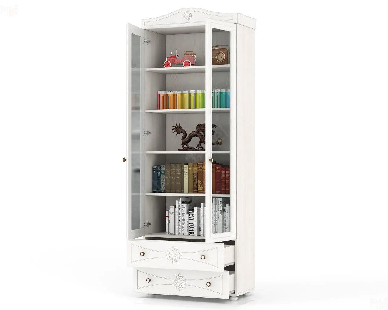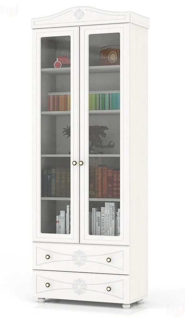 Шкаф книжный со стеклом ШК-37 Онега со стеклянными фасадами и двумя выдвижными ящиками.
