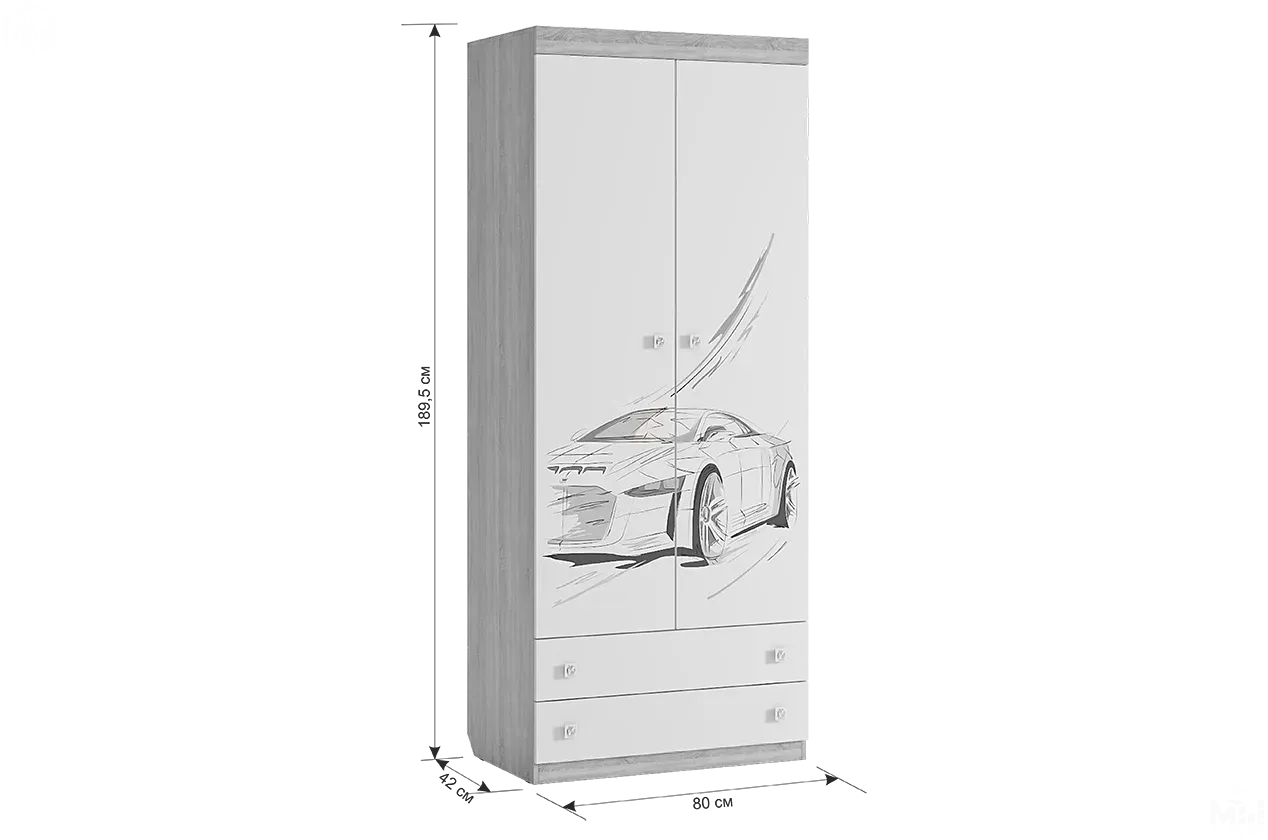 Вместительный шкаф «Форсаж» – мечта каждого мальчика. Длинная штанга для одежды и 2-а больших выдвижных ящика для белья - отличное решение для детской. Эффектный принтерный рисунок на фасадах выдержан в общем стилистическом решении. Рисунок устойчив к истиранию и ультрафиолету.