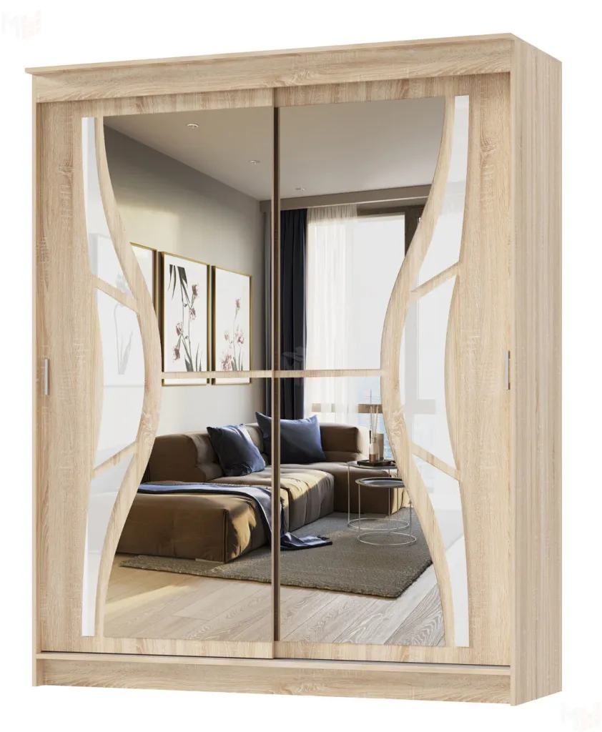 Шкаф-купе АЛЬЯНС двухстворчатый с зеркалами БАБОЧКА на алюминиевых направляющих, размерным рядом по ширине 1,5 м, 1,8 м и 2,0 м, с полками, металлической штангой штангой для верхней одежды и двумя ящиками на роликовых направляющих. Так же Покупатель может заказать шкаф-купе с зеркалами ФАВОРИТ или ОРИОН.