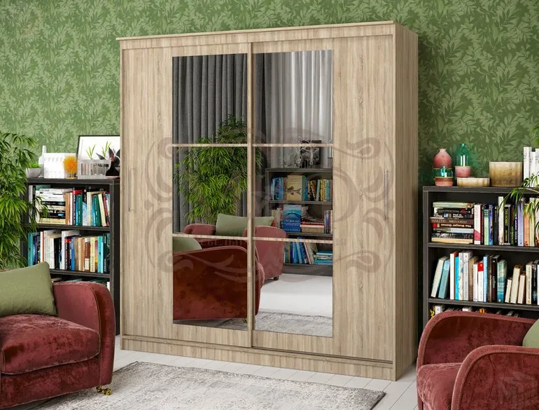 Шкаф Элегант №3 разделен на несколько частей. В одной есть штанга для одежды, в другой полки для белья, выдвижные ящики. Двери шкафа декорированы фигурными зеркалами. Варианты цвета корпуса - венге, дуб сонома, ясень шимо темный.