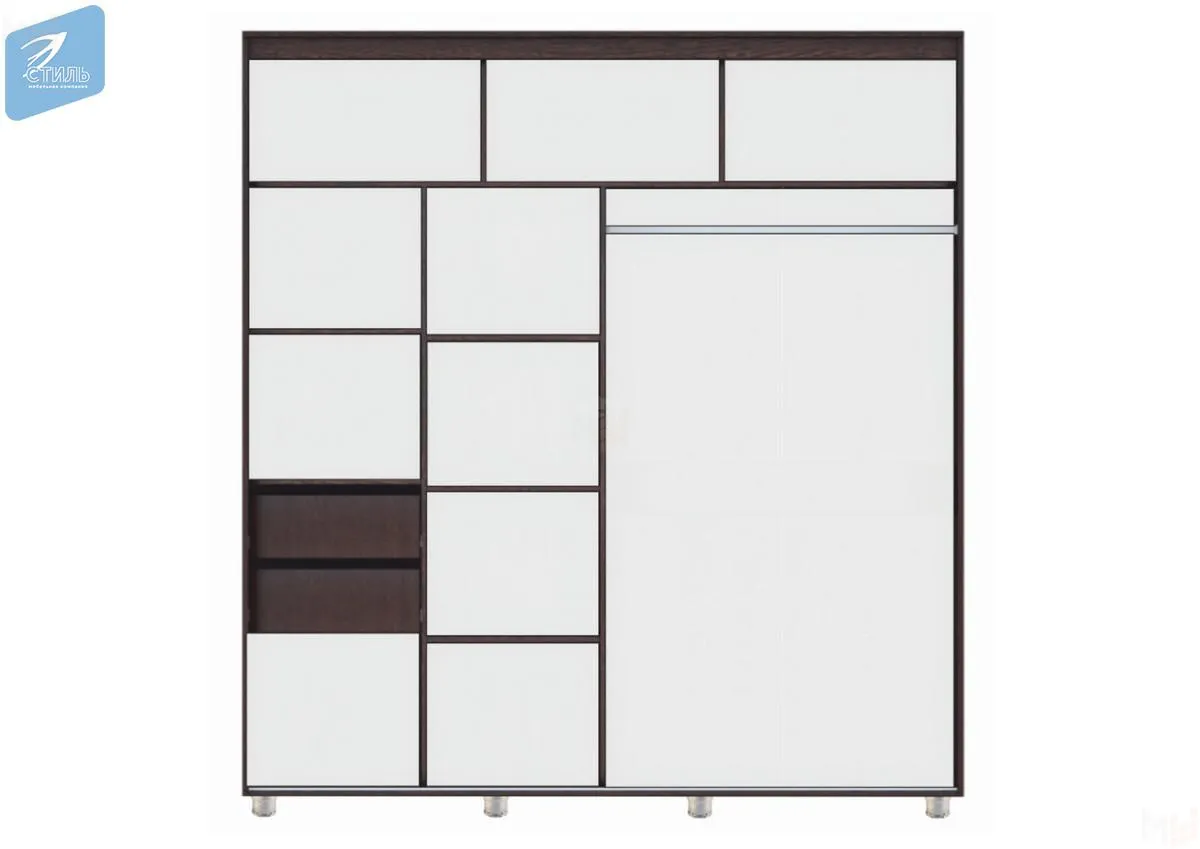 Оригинальные стекла лакобель, украшающие фасад, прекрасно смотрятся в сочетании с оригинальным цветовым решением корпуса и эта удачная комбинация является главной «изюминкой» этого шкафа. Линейка представлена в двух вариациях 1,5 и 2 м.