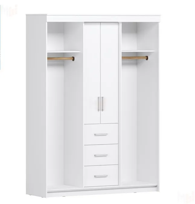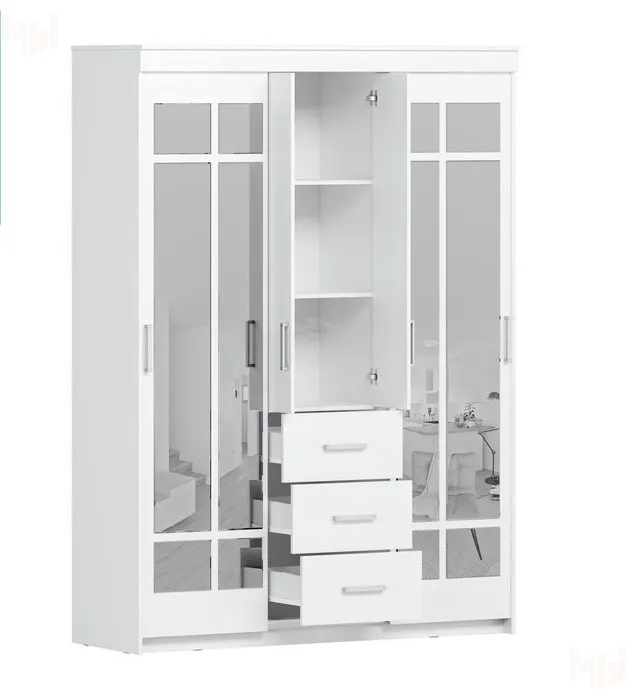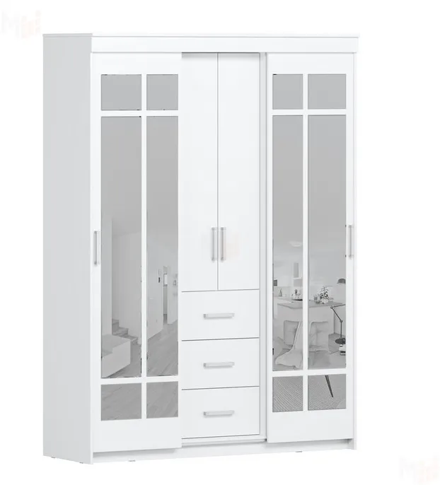 Шкаф-купе по конструкции является комбинированным. Т.е. слева и справа размещены створки купе, которые перемещаются по длине шкафа на однополозном верхнем треке и закрываю отделения для хранения верхней одежды. В центральной части шкафа-купе располагаются снизу три выдвижных ящика и выше две распашных створки. За двумя распашными створками находятся три ниши для хранения белья.