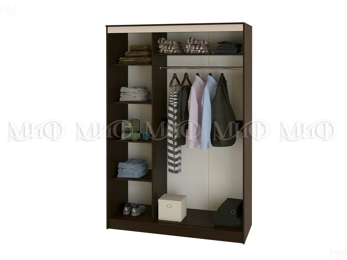 В левой части шкафа расположены полки для одежды, справа секция для верхней одежды. Цвет шкафа венге/беленый дуб. -