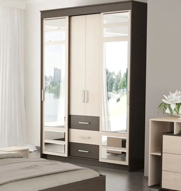Каркас шкафа выполнен в темном цвете венге. Раздвижные двери шкафа выполнены в контрастном цвете дуб молочный, что делает этот предмет мебели изысканным и стильным. Двери декорированы зеркалами.