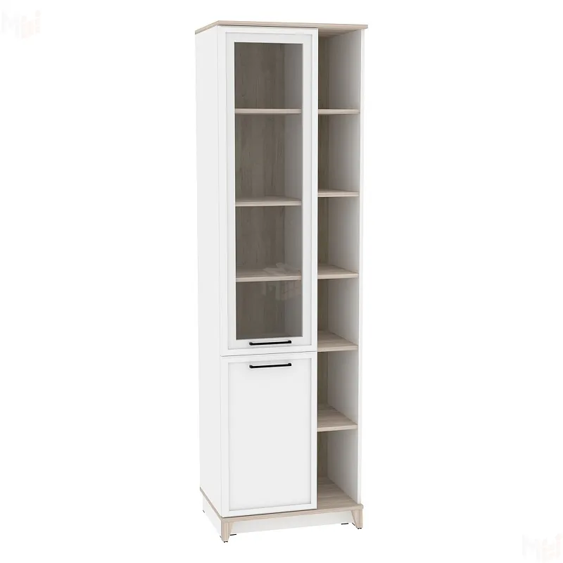 Задняя стенка шкафа в древесном декоре устанавливается в паз, поэтому выглядит аккуратно со всех сторон. Многофункциональный шкаф для гостиной – цельное решение, разделить его на элементы и поставить отдельно друг от друга нельзя. В него можно поставить только самое ценное: полки толщиной 16 мм выдерживают нагрузку до 10 кг. Открытое стеллажное отделение позволит сохранить в порядке семейные документы, книги. -