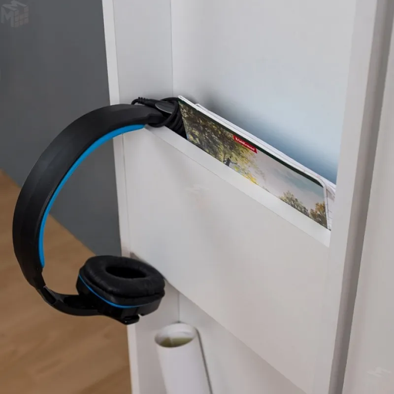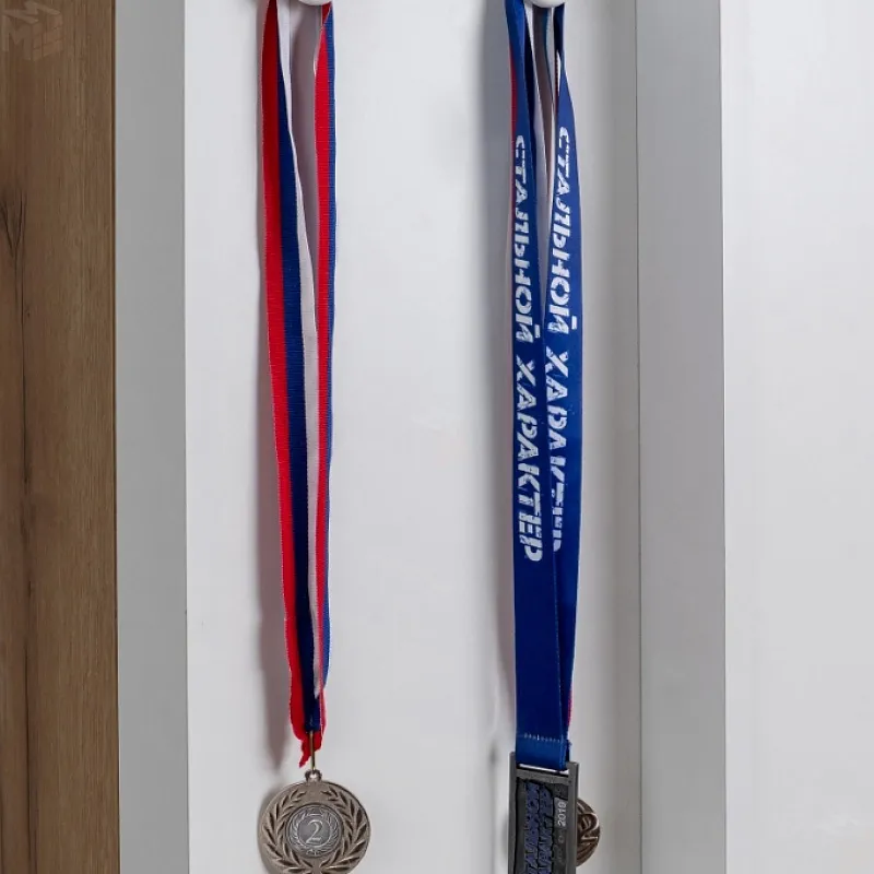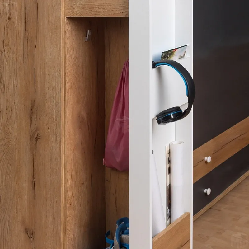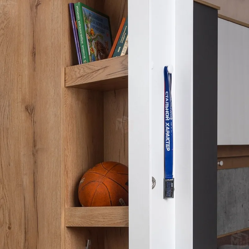 Внутри шкафа полки с ограничителями и ниша с крючками, где можно хранить форму для тренировок, мячи, ролики, наборы для творчества и другие аксессуары для хобби. Зона хранения на самом фасаде включает в себя: карман для высоких бумаг и ватманов, ручку, выполненную виде полочки, и два крючка, на которые удобно повесить заработанные медали, скакалки, элементы декора.