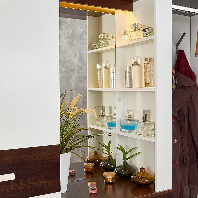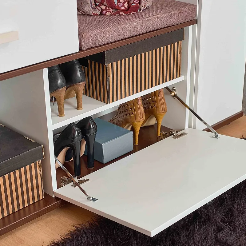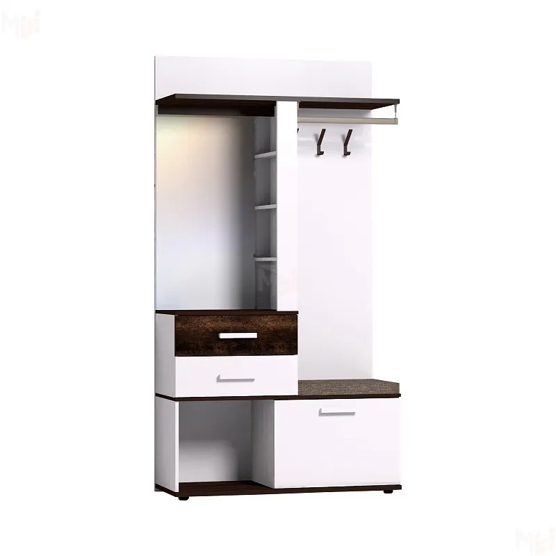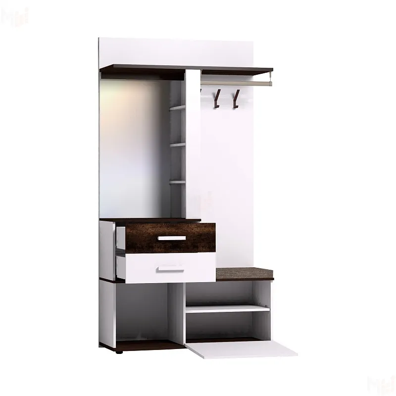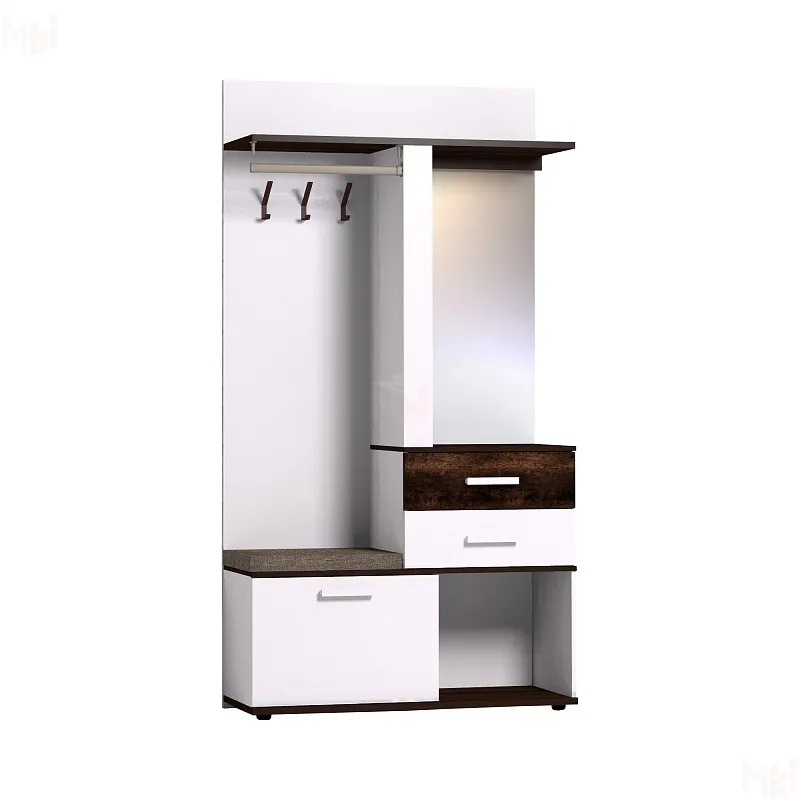 Встроенная светодиодная подсветка включается при помощи аккуратного кнопочного выключателя. Откидной фасад дополнительно фиксируется при закрывании магнитной защелкой. Горизонтальные детали толщиной 22 мм и фасад верхнего ящика из теплого темного ЛДСП в декоре Орех Шоколадный играют на контрасте с белым декором модуля. В комплектацию входит мягкое сидение, которое позволяет обуваться с комфортом. Регулируемые опоры помогают компенсировать неровности пола в прихожей. Собрать Шкаф МЦН можно как на правую, так и на левую сторону.