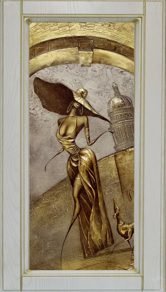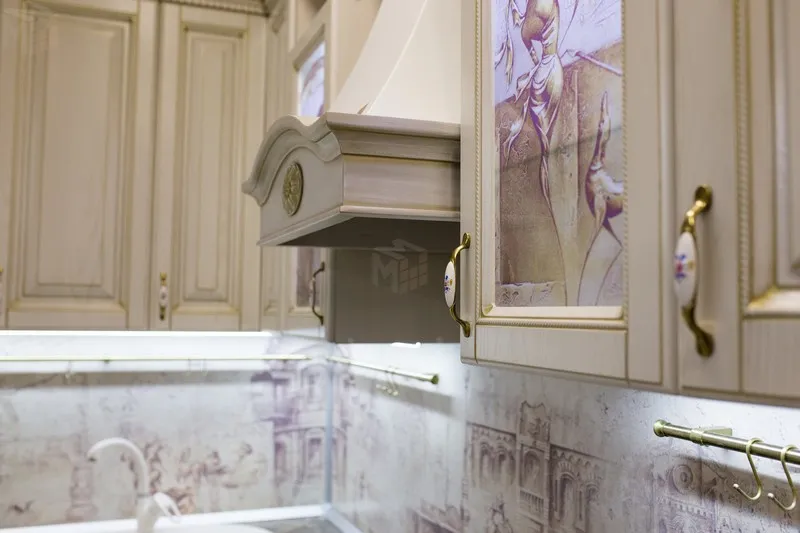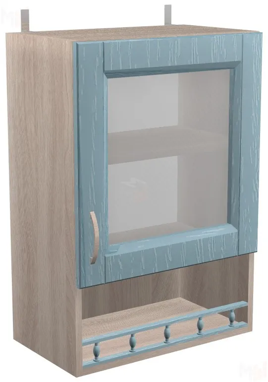 Шкафчик навесной кухонный с полочкой, украшенной балюстрадой и витражным стеклом.