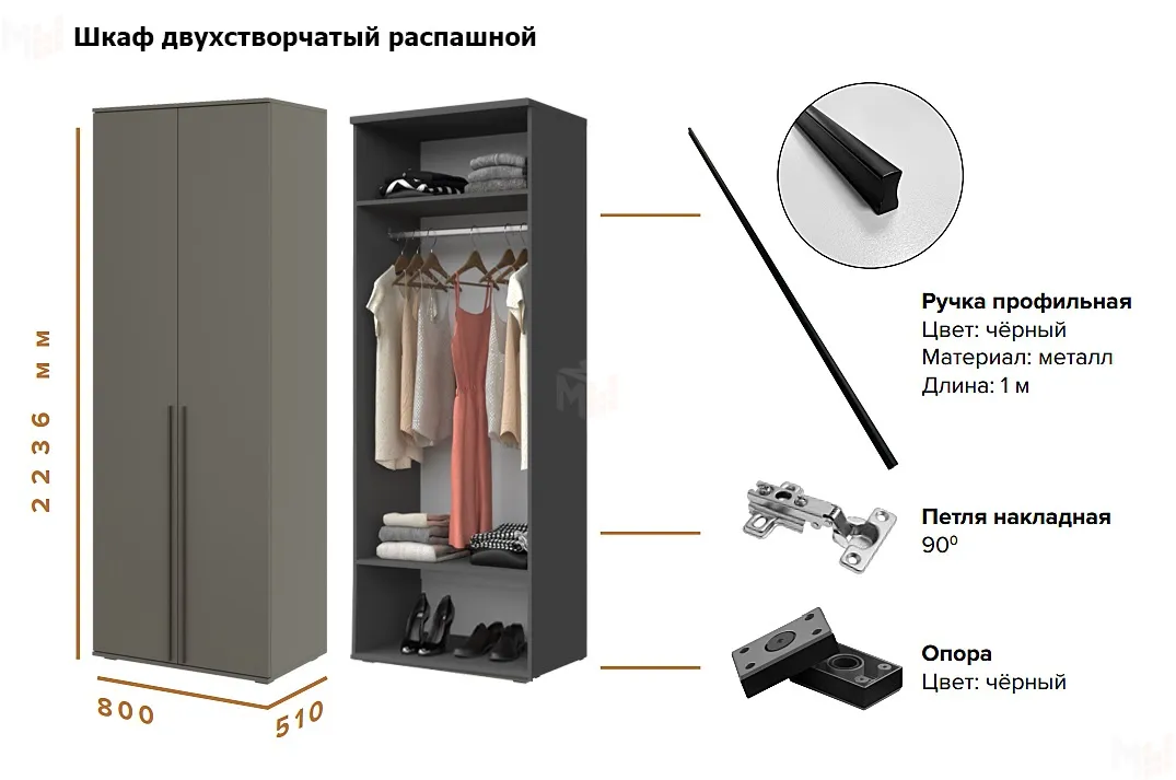 Имеет большую высоту 2236 мм, шкаф можно дополнить антресолью.