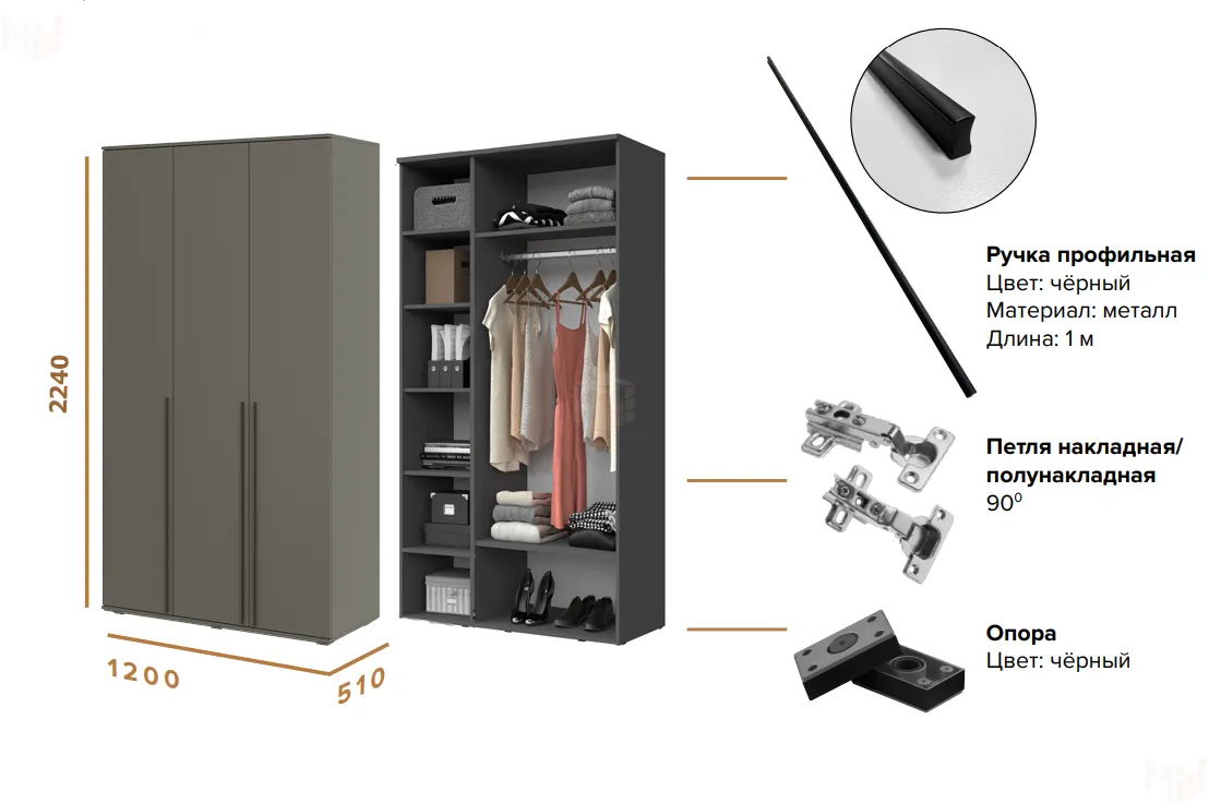 Наполнение шкафа - полки для белья, штанги для плечиков.