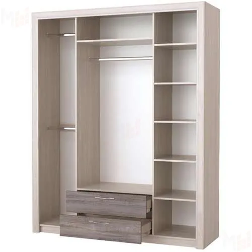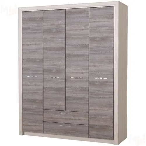 Шкаф 4С2Я "Октава" 4-створчатый с ящиками, с полками для белья и поперечными металлическими штангами для одежды. Устанавливается стильная металлическая ручка, декор "тёмный никель". Периметр шкафа обрамлён профилем MDF оригинальной формы с патиной (окраской фасок) серебристого цвета. Направляющие шариковые, полного выдвижения. Опционально можно доукомплектовать зеркалами.