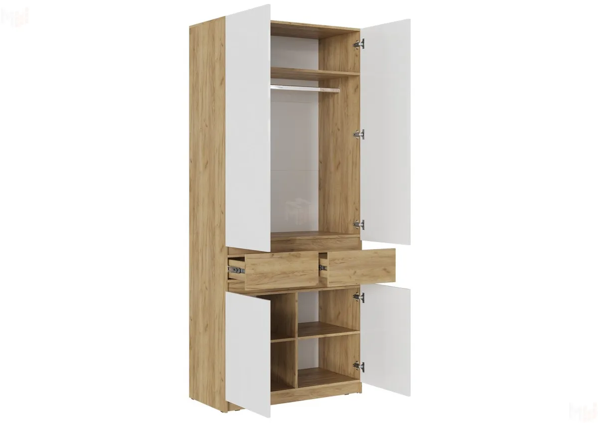 Корпус шкафа выполнен из ЛДСП Крафт золотой, фасады ЛДСП Белый глянец. -