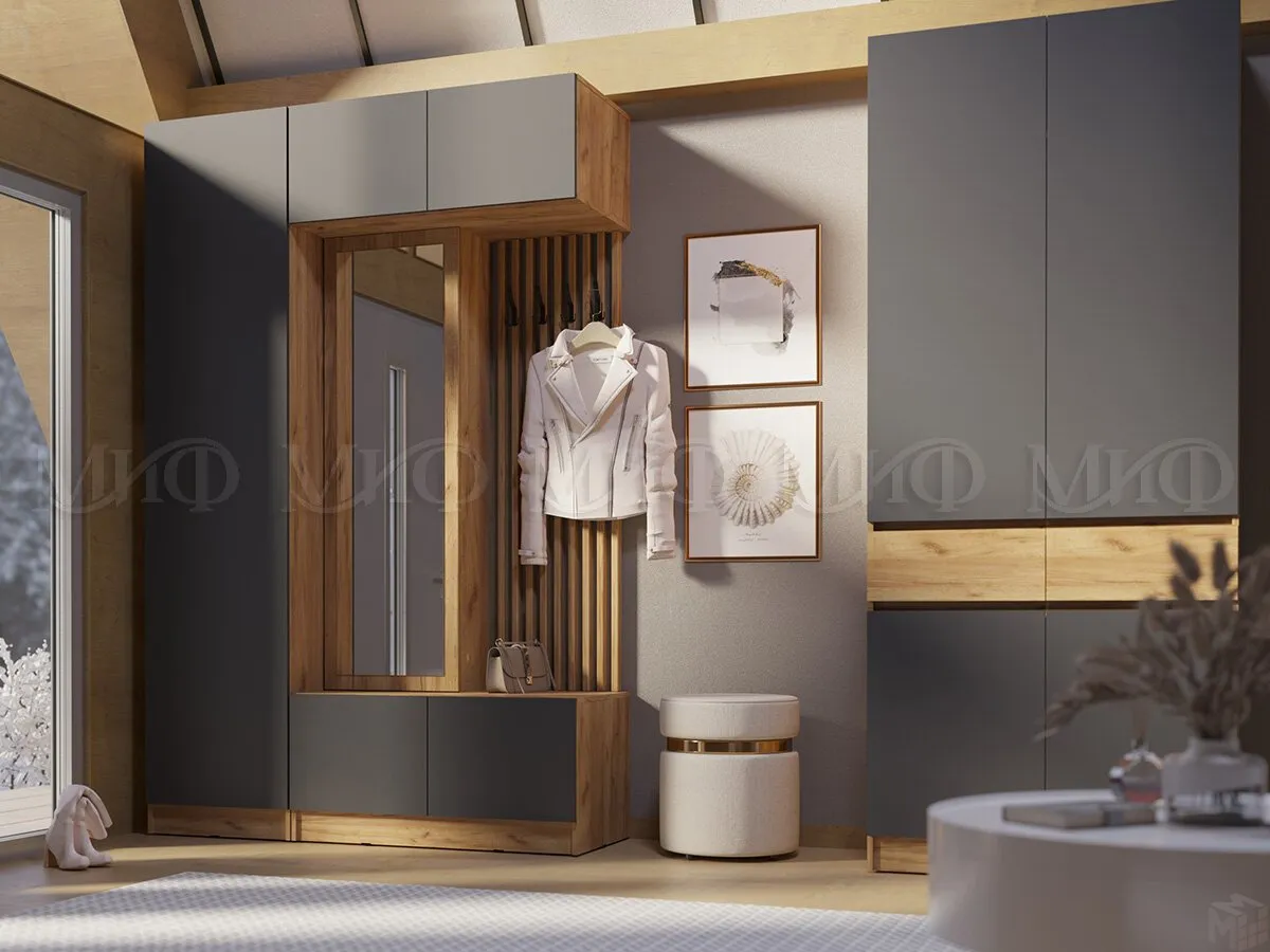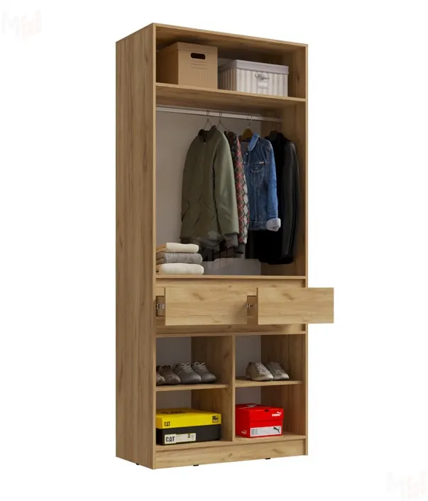 Этот высокий, вместительный и в то же время компактный шкаф будет великолепно смотреться в тандеме с прихожей Роджина. Помимо объемного отсека под одежду с металлической штангой, в шкафу Роджина предусмотрено два удобных выдвижных ящика на шариковых направляющих, а также четыре полки небольшого размера и большая верхняя полка-антресоль.