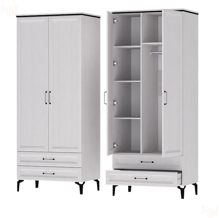 Функциональный, практичный двухдверный шкаф отлично впишется в интерьер любой комнаты. Он вместит в себя достаточное количество вещей благодаря наличию полок, металлической штанги и двух выдвижных ящиков.