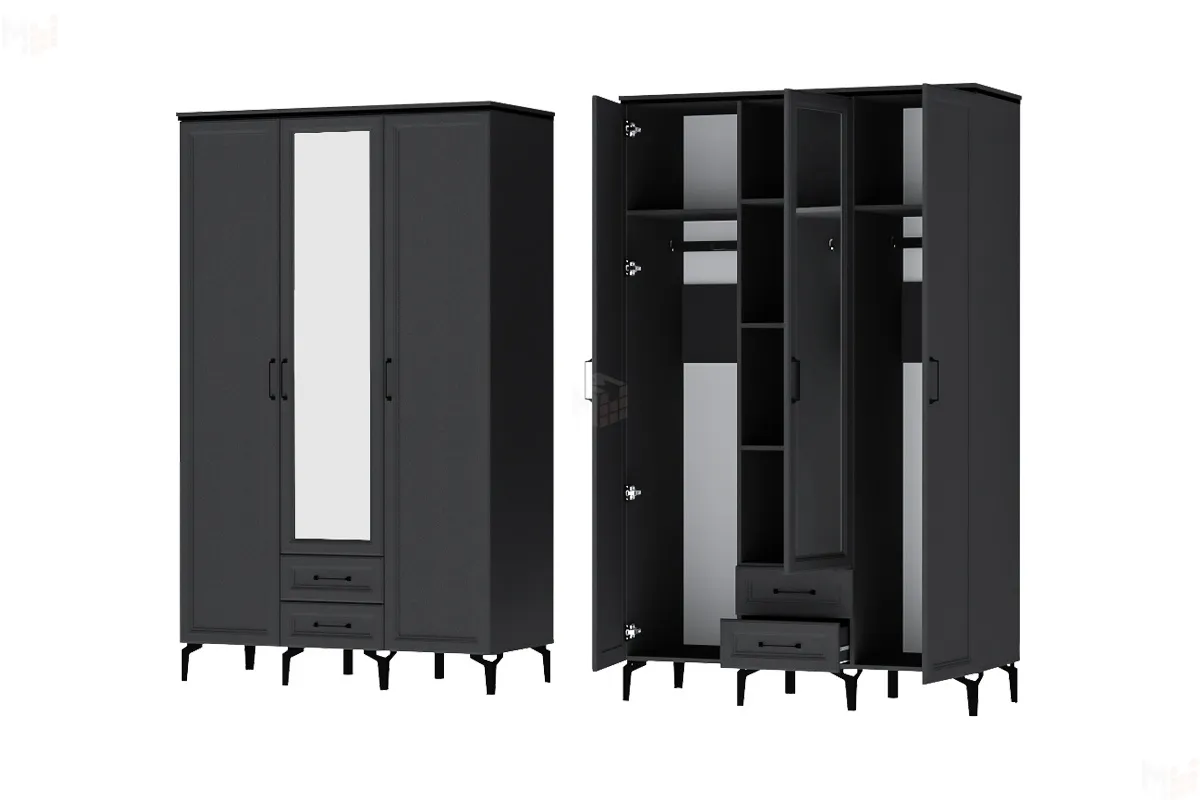 Внутреннее наполнение: две крайние секции со штангой для одежды и полкой, средняя секция с тремя полками и двумя ящиками. -