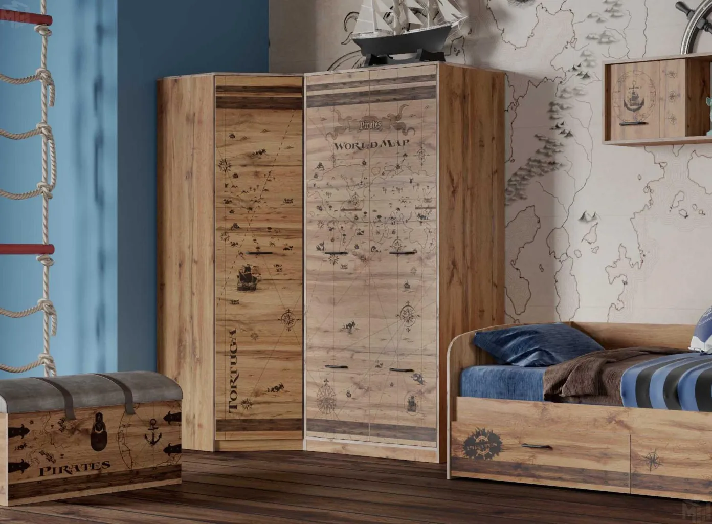 При оформлении детской на первый план выходит рациональное использование полезного пространства, ведь здесь ребенок не только отдыхает, но и играет, делает уроки, занимается творчеством и спортом. Наши дизайнеры при создании коллекций продумывают каждую деталь, опираясь на актуальные тенденции. Шкаф угловой «Фрегат» — один из примеров идеального сочетания практичности, оригинальности и долговечности. Цветовое исполнение подходит сразу для нескольких стилей, а габариты — для комнат разной площади. Мебель для детской создается из безопасных материалов с отличной износостойкостью.