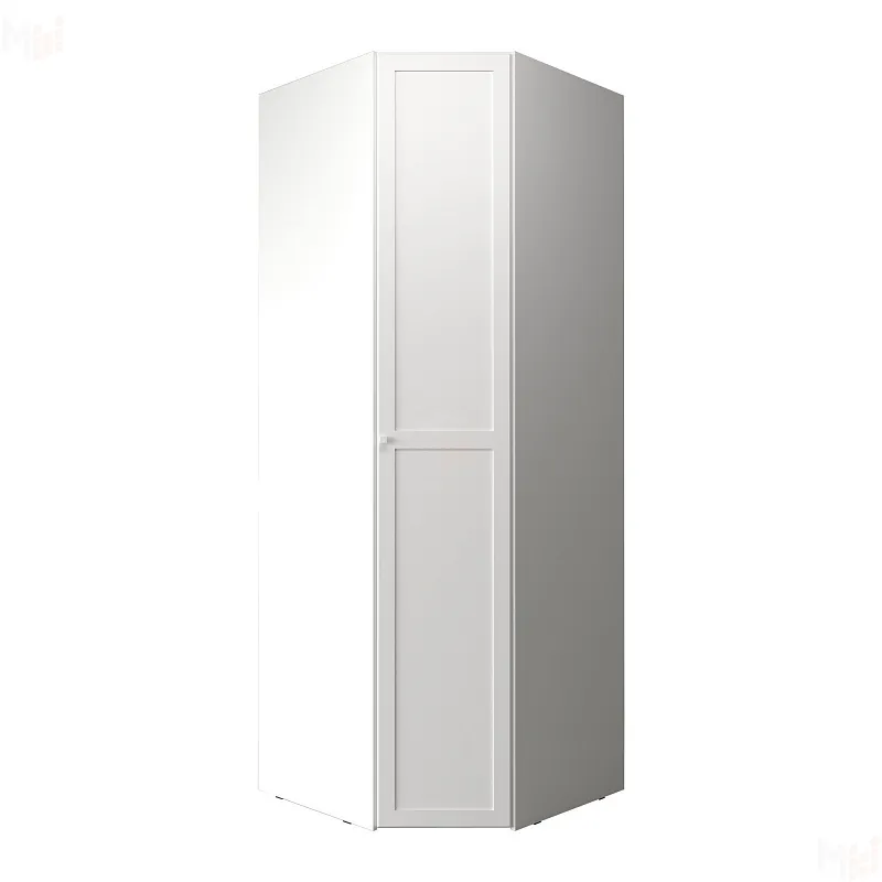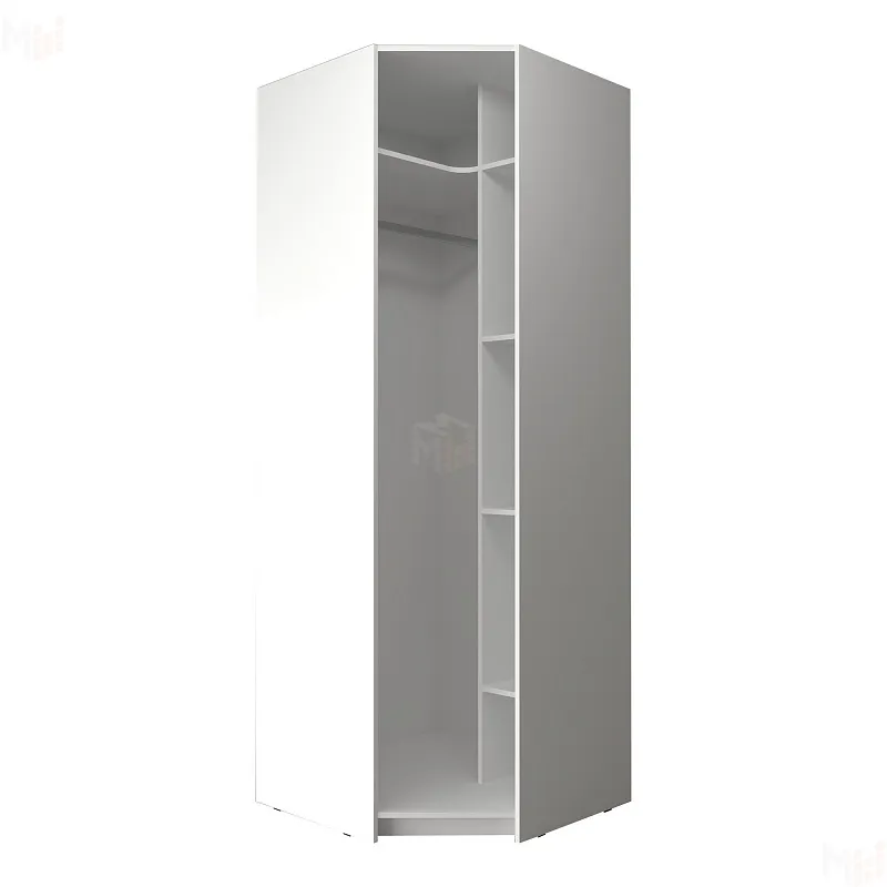 Угловой высокий шкаф помогает рационально использовать площадь комнаты. Он комплектуется внутренним стеллажом с регулируемыми по высоте полками и стационарной штангой для одежды. Шкаф разделён на отдельно продающиеся элементы: корпус и фасад - Зеркало и Стандарт. В этом варианте корпус докомплектовывается фасадом Стандарт. Аккуратная рама из МДФ обрамляет фасад по периметру. Шкаф обязательно крепить к стене за подвесы.