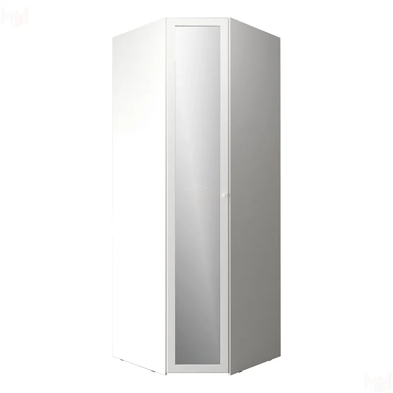 Угловой высокий шкаф помогает рационально использовать площадь комнаты. Он комплектуется внутренним стеллажом с регулируемыми по высоте полками и стационарной штангой для одежды. Шкаф разделён на отдельно продающиеся элементы: корпус и фасад - Зеркало и Стандарт.