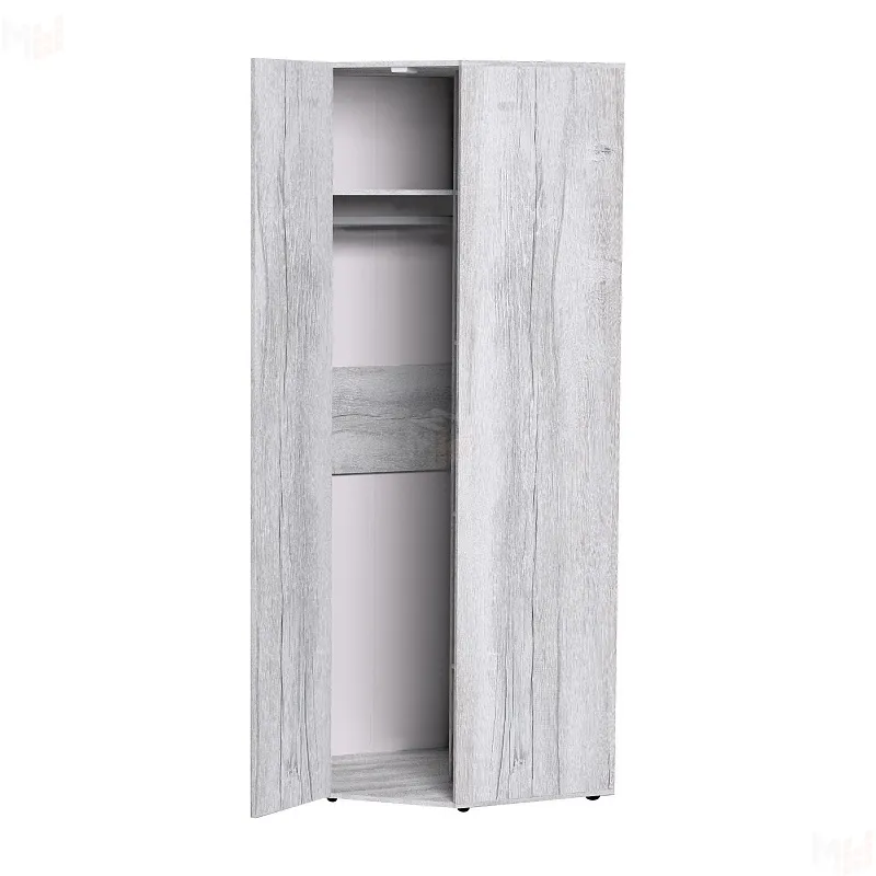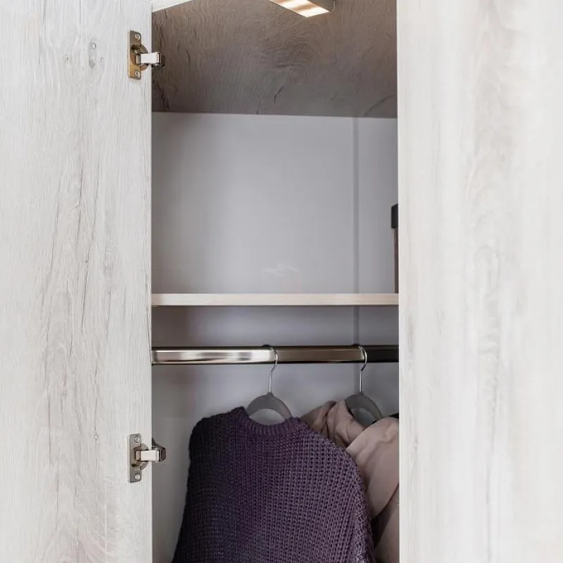 Эффективно организовать пространство в маленькой спальне поможет угловой шкаф. Стационарная штанга длиной 814 мм и полноценный стеллаж для белья внутри способствуют аккуратной организации вещей. Гладкие фасады и натуральный декор шкафа привнесут в комнату уют и теплоту. Шкаф оснащен беспроводным светодиодным светильником, который включается при открывании двери. Это особенно удобно, если нужно найти в шкафу вещи, не потревожив близких. Легкая установка на магнитное крепление не требует дополнительного сверления, прокладывания провода, подключения к сети. Регулируемые опоры компенсируют неровности пола. Шкаф необходимо обязательно крепить к стене на подвесы!