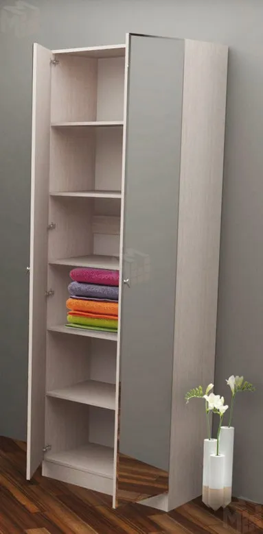 На наружных дверцах данного шкафа установлены зеркала. Шкаф имеет две распашные двери. Открыв их внутри можно найти 6 глубоких и широких полок.