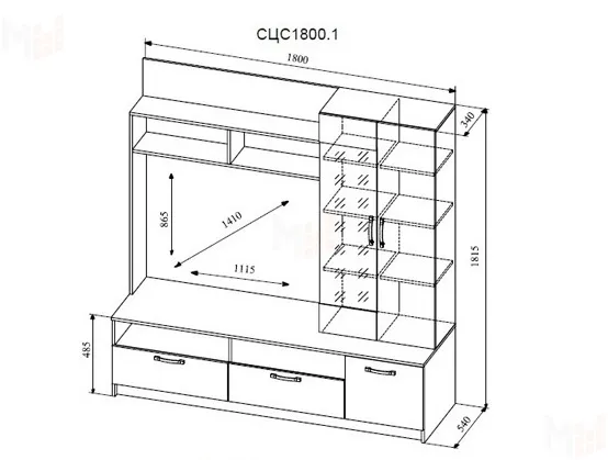 ширина 1800 мм, глубина 540 мм, высота 1815 мм