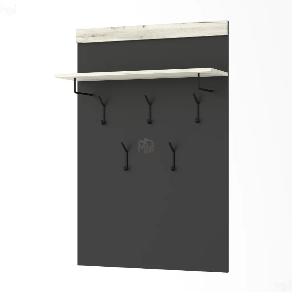 Вешалка "СОНАТА" ВШС-800 с полкой навесная. Чёрные матовые металлические крючки и уголки для опоры полки. Крепится к стене через навесные элементы. Верхняя часть вешалки обрамлёна профилем MDF. -