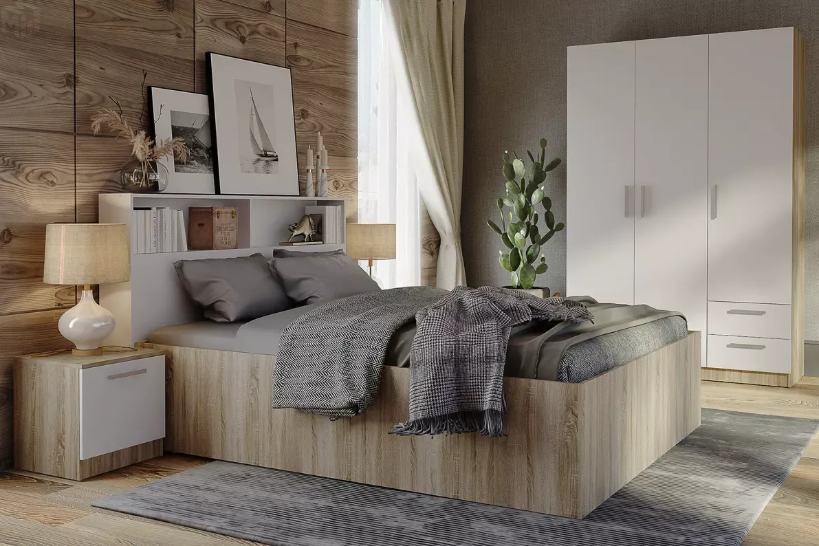 Корпус спальни изготовлен из 16 мм ламинированной древесностружечной плиты цвет –«Белый» и «Дуб Сонома». Торцевые поверхности корпуса закромлены кромками полипропилен. Фасады изготовлены из 16 мм ламинированной древесностружечной плиты цвет –«Белый» и «Дуб Сонома».