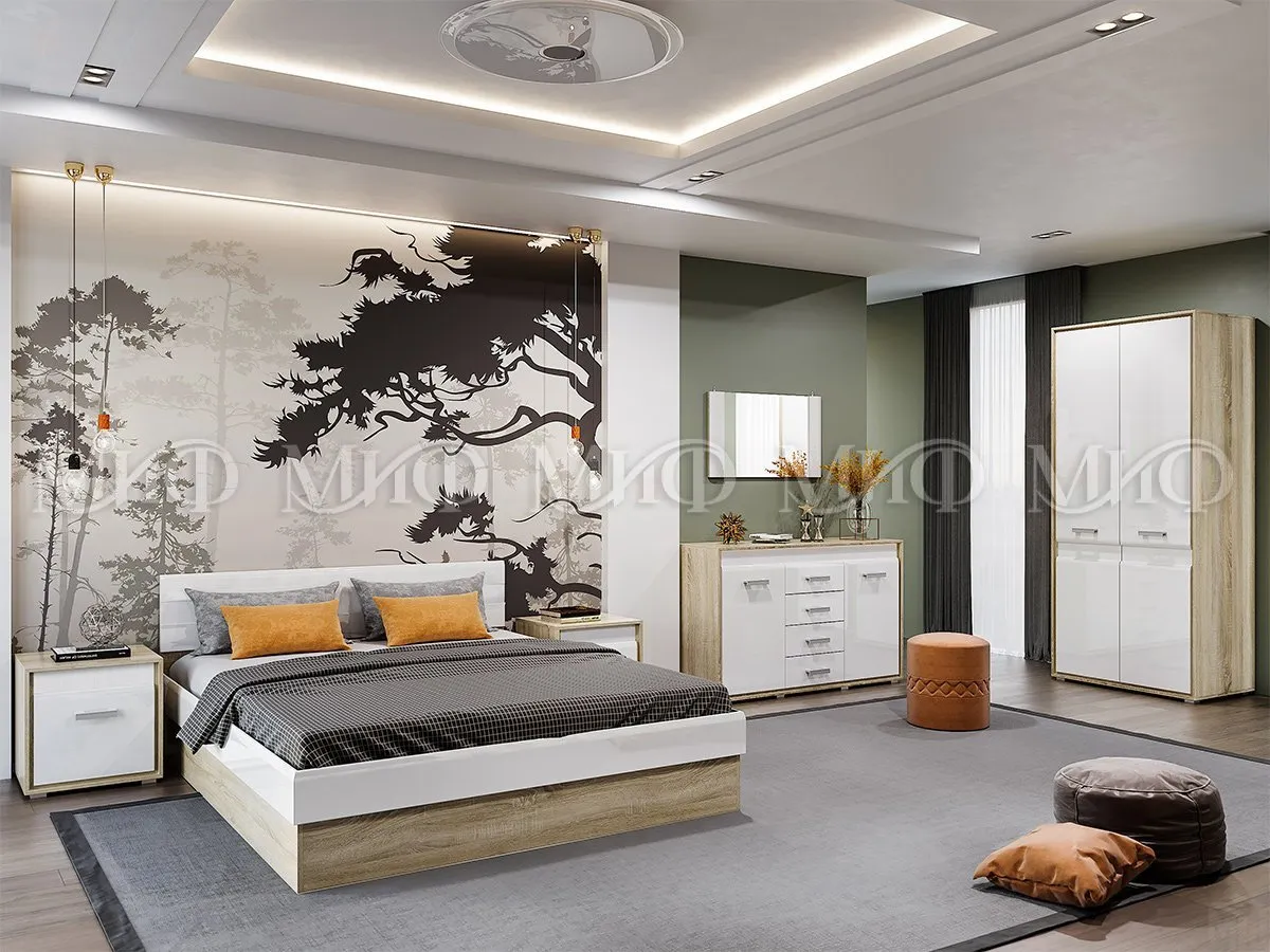 В стоимость также входит 2 прикроватные тумбы (ширина 500 мм, глубина 464 мм, высота 506 мм), комод (ширина 1380 мм, глубина 464 мм, высота 858 мм), шкаф 2-х дверный (ширина 940 мм, глубина 560 мм, высота 2150 мм). Наполнение шкафа - верхняя и нижняя полки, штанга для одежды.