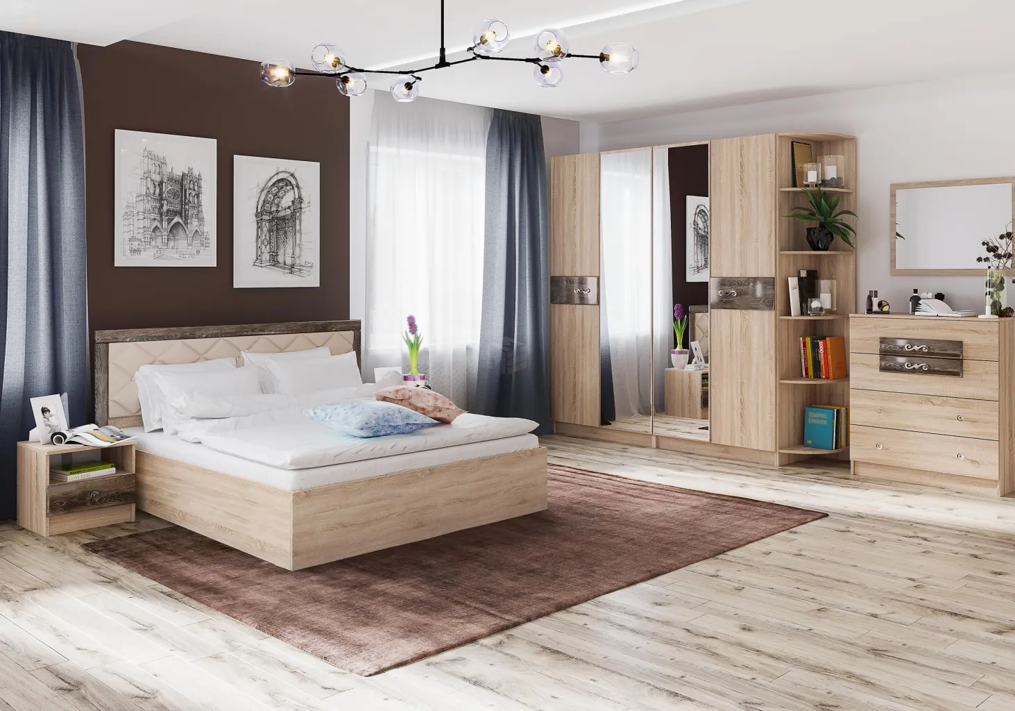 Спальный гарнитур выполнен в цвете «Дуб Сонома» с накладками из МДФ в пленке ПВХ цвета «Дуб Шале мореный» или «Дуб Шале серебро».