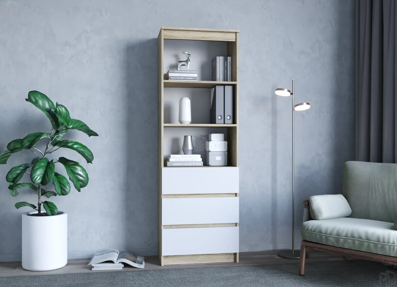 Корпус стеллажа выполнен из ЛДСП цвета дуб сонома 16 мм. Фасады ЛДСП белый глянец.