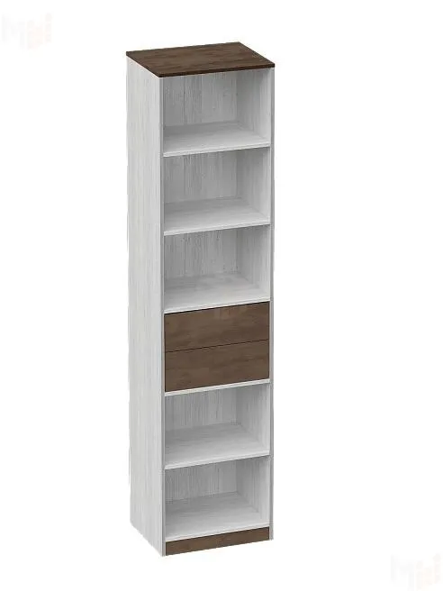 Четыре открытые полки и два выдвижных ящика на шариковых направляющих. -