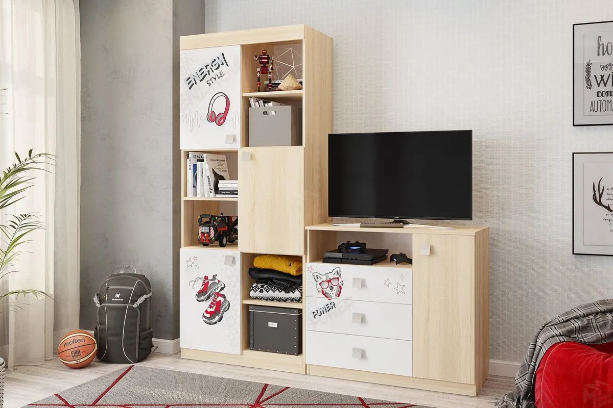 Стеллаж с открытыми и закрытыми полками идеально подойдет для книг, игрушек и мелочей. Эффектный принтерный рисунок на фасадах выдержан в общем стилистическом решении. Рисунок устойчив к истиранию и ультрафиолету. Детская «Энерджи»- все, что нужно для современного подростка! -