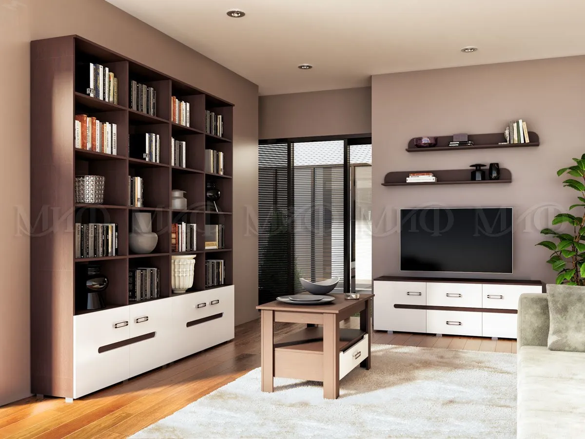Стеллаж можно дополнить модулями для гостиной серии Ким. -