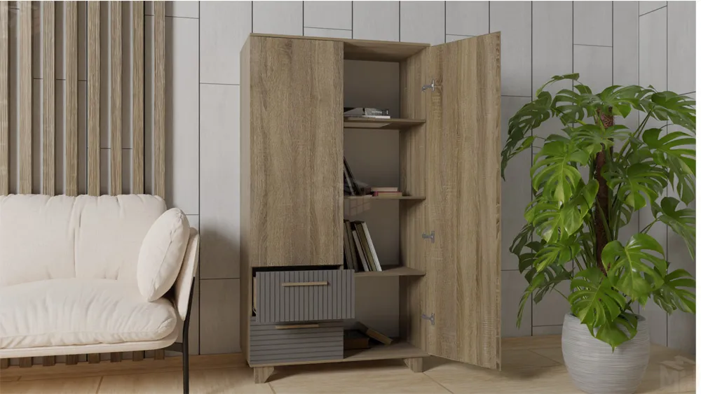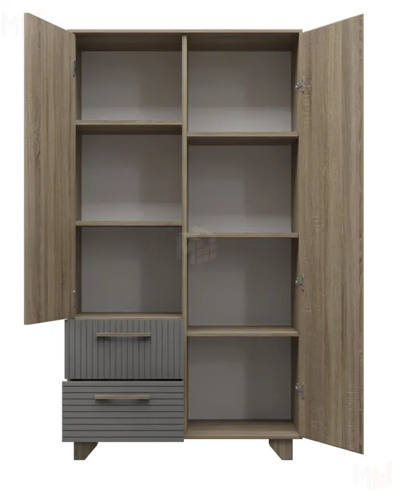 Стеллаж Копенгаген без стекла станет для гостиной практичным функциональным дополнением. Стеллаж имеет семь полок и два выдвижных ящика. Створки оснащены петлями с доводчиками, ящики — шариковыми направляющими полного выдвижения. В конструкции стеллажа предусмотрен механизм открывания нажатием «push-to-open». Ручки ящиков выполнены из натурального массива дуба. Ножки изготовлены из массива дерева и регулируются по высоте. -