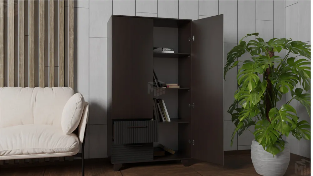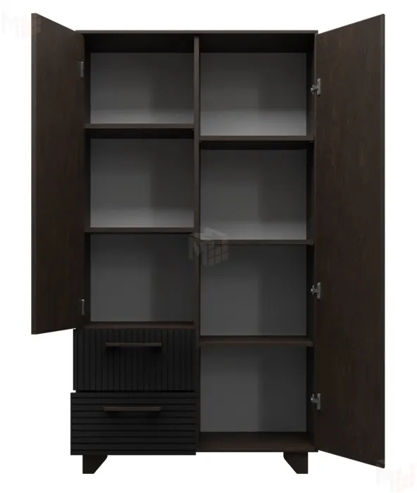 Стеллаж Копенгаген без стекла станет для гостиной практичным функциональным дополнением. Стеллаж имеет семь полок и два выдвижных ящика. Створки оснащены петлями с доводчиками, ящики — шариковыми направляющими полного выдвижения. В конструкции стеллажа предусмотрен механизм открывания нажатием «push-to-open». Ручки ящиков выполнены из натурального массива дуба. Ножки изготовлены из массива дерева и регулируются по высоте. -