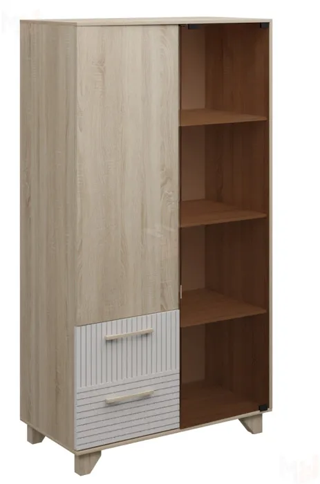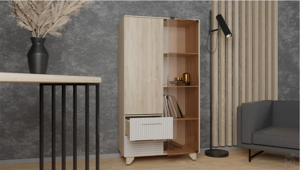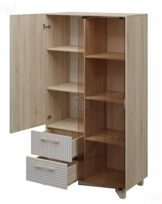 Стеллаж со стеклом Копенгаген — это практичное и дизайнерское решение для гостиной. Стеллаж имеет семь полок и два ящика. Ящики оснащены шариковыми направляющими полного выдвижения. Створки выполнены из ЛДСП и стекла, что позволяет хранить как необходимые предметы, так и предметы декора. Створки крепятся на петли с доводчиками для плавности хода. Конструкцией предусмотрен механизм открывания створок «push-to-open». Ручки ящиков из натурального массива дуба. Опоры изделия выполнены из массива дерева и имеют регулировку по высоте. Сочетание расцветки фасадов ящика и корпуса модели поможет подобрать идеальный вариант к обстановке помещения. -