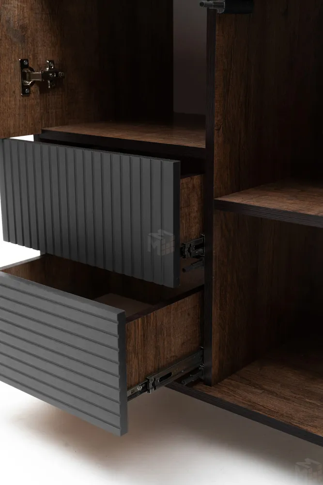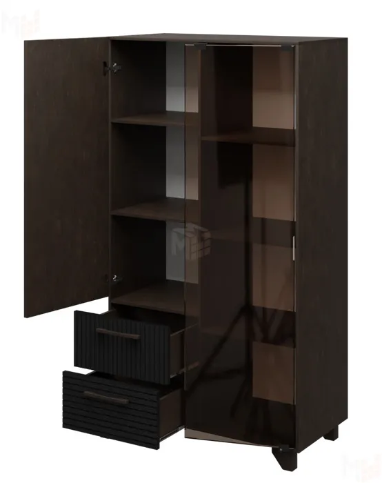 Стеллаж со стеклом Копенгаген — это практичное и дизайнерское решение для гостиной. Стеллаж имеет семь полок и два ящика. Ящики оснащены шариковыми направляющими полного выдвижения. Створки выполнены из ЛДСП и стекла, что позволяет хранить как необходимые предметы, так и предметы декора. Створки крепятся на петли с доводчиками для плавности хода. Конструкцией предусмотрен механизм открывания створок «push-to-open». Ручки ящиков из натурального массива дуба. Опоры изделия выполнены из массива дерева и имеют регулировку по высоте. Сочетание расцветки фасадов ящика и корпуса модели поможет подобрать идеальный вариант к обстановке помещения. -