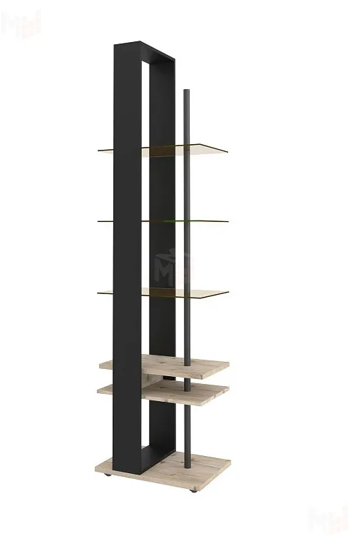 Изящный и стильный стеллаж с открытыми полками не займёт много свободного места, но станет значимой интерьерной деталью гостиной. Комбинация стеклянных полок и элементов «под дерево» выглядит стильно и очень достойно. Благодаря невидимым глазу креплениям создается впечатление, что стеклянные полки зависли в воздухе. Но несмотря на кажущуюся легкость и воздушность, тонированное стекло (бронза) выдерживает нагрузку до 5 кг, что позволит разместить на стеллаже любимые книги, диски, комнатные растения или предметы декора.